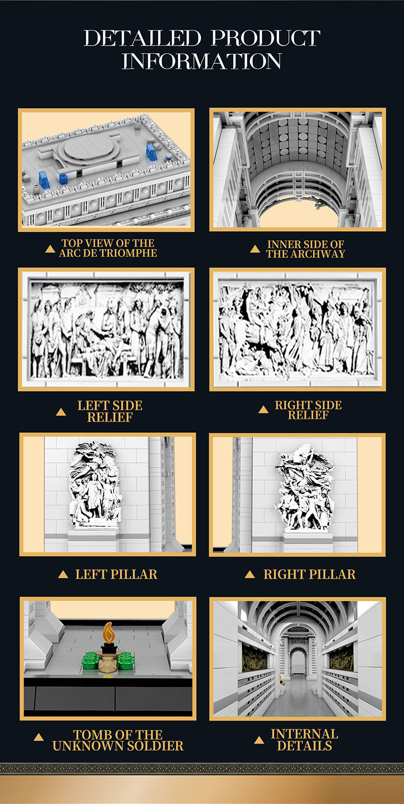 - Projekt inspirowany oryginalnym Łukiem Triumfalnym w Paryżu (Arc de Triomphe) – dokładnie odwzorowane proporcje i charakterystyczny styl klasycystyczny, oddający majestat i potęgę budowli, symbolu zwycięstwa i historii Francji.