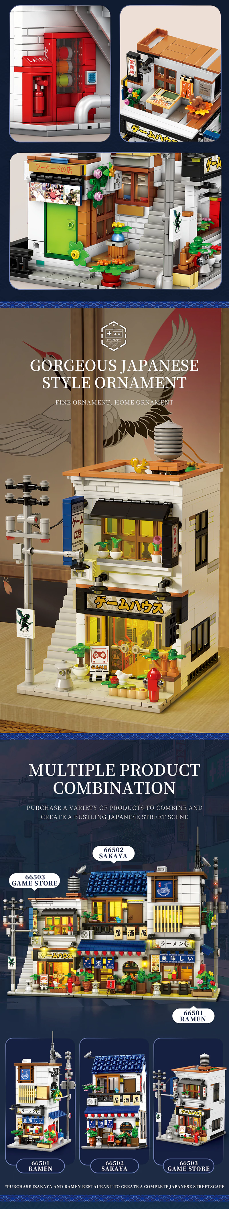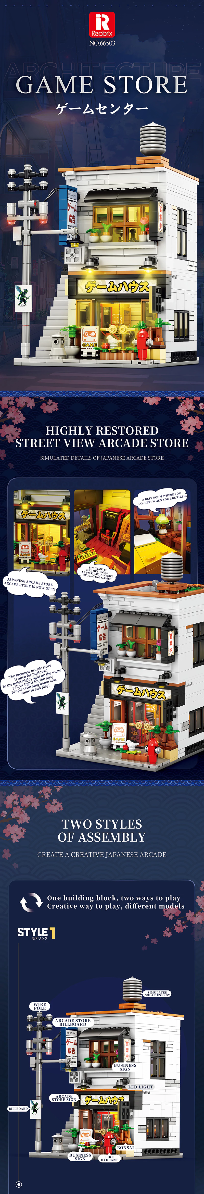 - Połącz zestawy 66501 i 66502, aby stworzyć tętniącą życiem japońską scenę uliczną - REOBRIX Salon Gier to część większej serii miejskich budynków inspirowanych Japonią.
