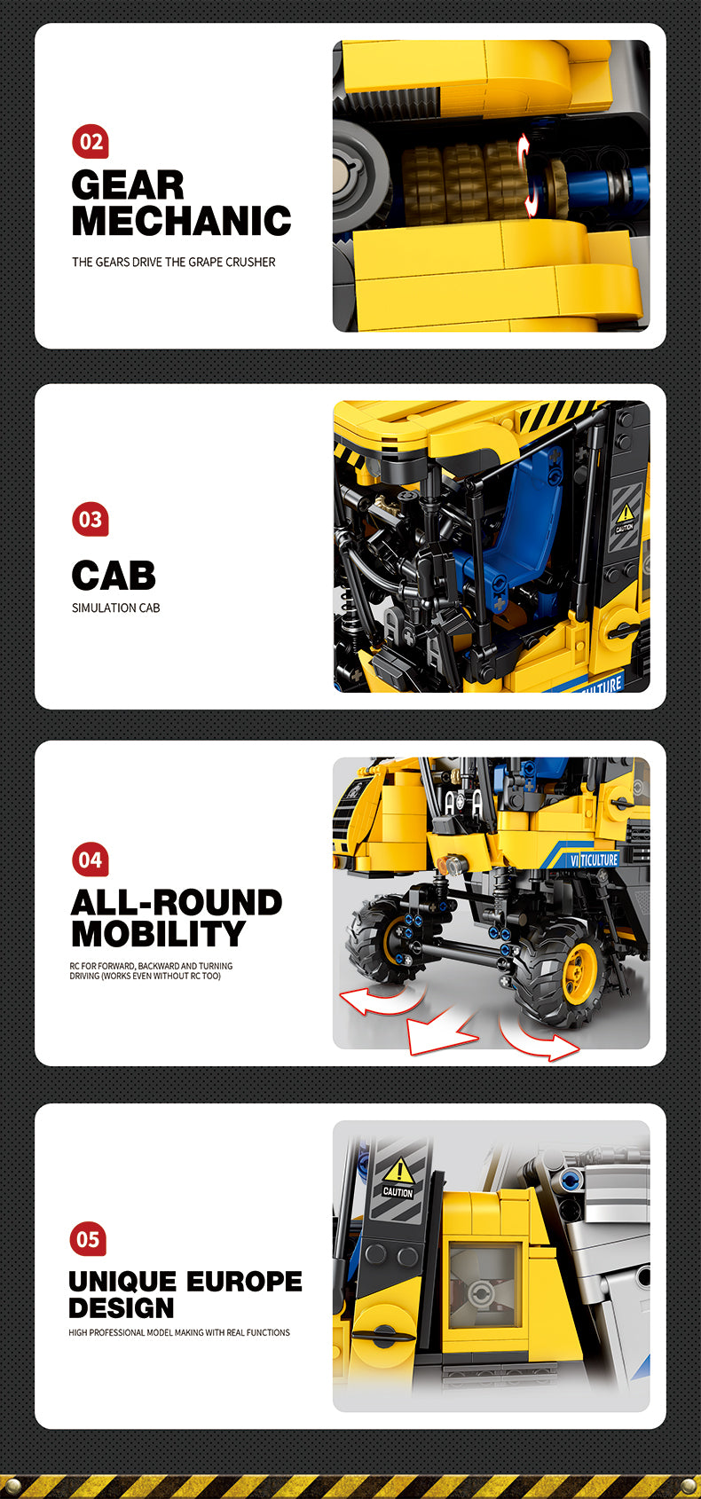 Model przedstawia zaawansowaną maszynę, wyposażoną w ruchome elementy, które umożliwiają symulowanie procesu zbierania winogron. Szczegółowe detale, takie jak otwierające się klapy czy ruchome ramiona, dodają realizmu i sprawiają, że zabawa staje się jeszcze bardziej wciągająca. Każdy element w tym zestawie został zaprojektowany, aby odzwierciedlić autentyczność wózka, oferując jednocześnie sporo frajdy podczas budowy.